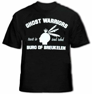 Soul Rebel Ghost Warriors T-Shirt. Soul Rebel has been making noise for the last couple of years now. Growing from a small collectors line to a full fledged brand. Style, character and comfort are paramount. These values are reflected in each garment that Soul Rebel produces. Our t-shirts are made from ultra soft, 100% machine washable cotton. On the front of this shirt is Soul Rebel Ghost Warriors Logo with the words Ghost Warriors Buro Of Breukelen.
