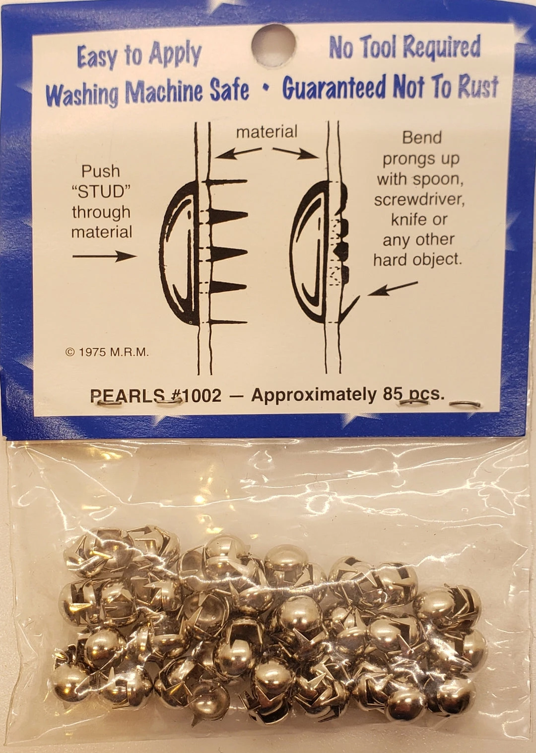 A solid bag of about 85 mini pearls! Domed and easy set with 2 back teeth. Perfect for any jacket, shoe, hat, glove, t-shirt & more! Use them as singular decorative pieces OR combine them to make intimidatingly awesome clusters!