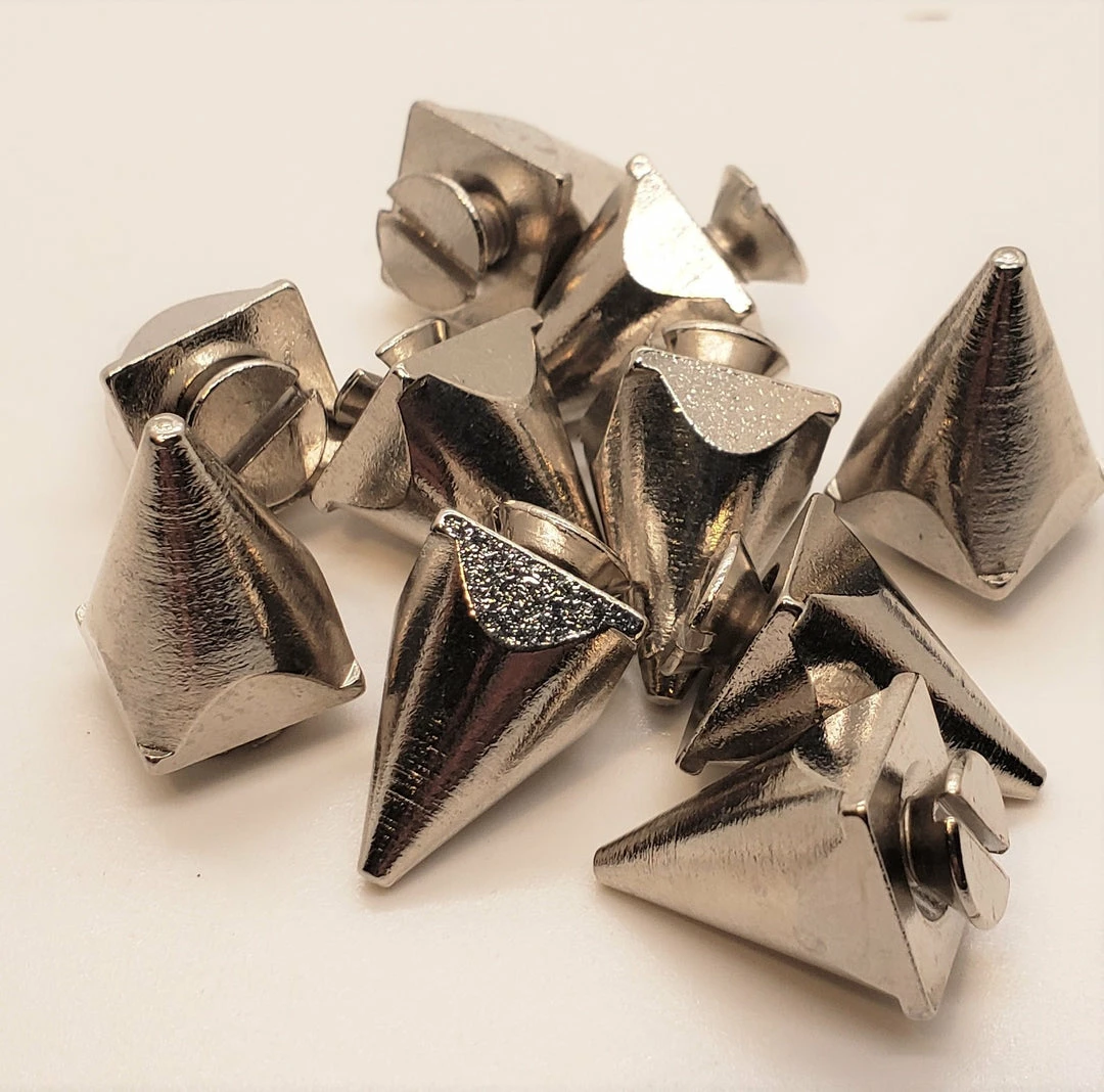A 10 pack of durable stainless steel spikes with squared bases. Perfect for any jacket, shoe, hat, glove, t-shirt & more! Use them as singular decorative pieces OR combine them to make intimidatingly awesome clusters!