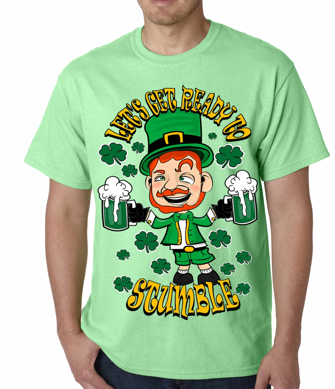 Huge Print St. Patrick’s Day – Let’s Get Ready To Stumble, with Leprechaun and Shamrocks all over… This is the ONLY shirt you need this St. Patricks Day – Let’s Get Ready To Stumble!
