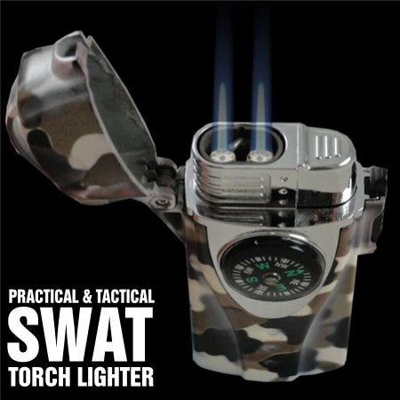 Tactical SWAT Gear Dual Torch Lighter. Here at BeWild, we have a huge selection of novelty lighters that are both humorous and functional, and with so many lighters to choose from you are sure to find the perfect lighter to suite your every need. This novelty lighter is Tactical SWAT Gear Torch Dual Lighter and is finished in satin brushed chrome with accented black matted jacket. To work this lighter simply push the right button, opening the top showing dual torch flames. This lighter also features a survival compass built into the front. Perfect for camping trips and hikes through the woods. Always be prepared with this Tactical SWAT Gear Dual Torch Lighter. This lighter is the fun novel way to show your fun side. COLORS SHIP ASSORTED! Makes a great Gift!!!
