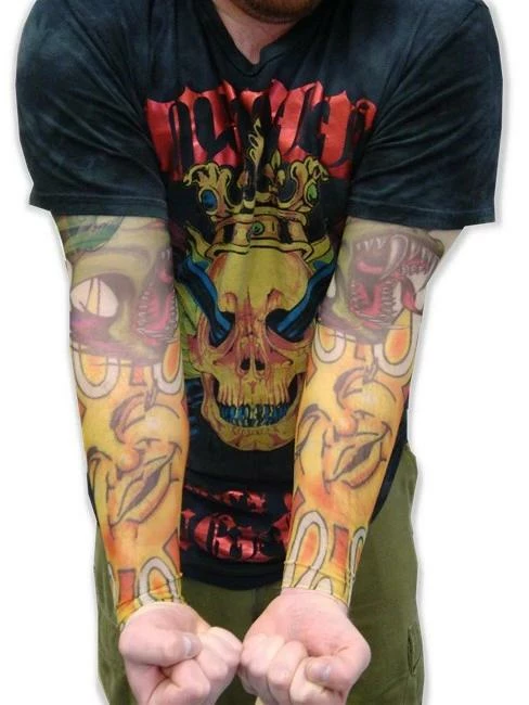 This fashion statement is a conversation piece and artwork of each piece is created by Illustrators, Painters and Tattoo artists from around the world. Our tattoos are hand printed one at a time and are of the highest quality available. These Tattoo Sleeves Feature raging dragon and majestic sun tattoo sleeve design.