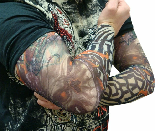 Tattoo Sleeves – Tribal Biker Pair of Tattoo Sleeve. Introducing the NEW Tattoo Sleeve fashion accessory! Anyone that wants the cool tattooed look without the commitment (and pain) of getting a permanent tattoo will love these! This design features a sharp tribal design with a nasty skeleton. These are perfect for men and woman.