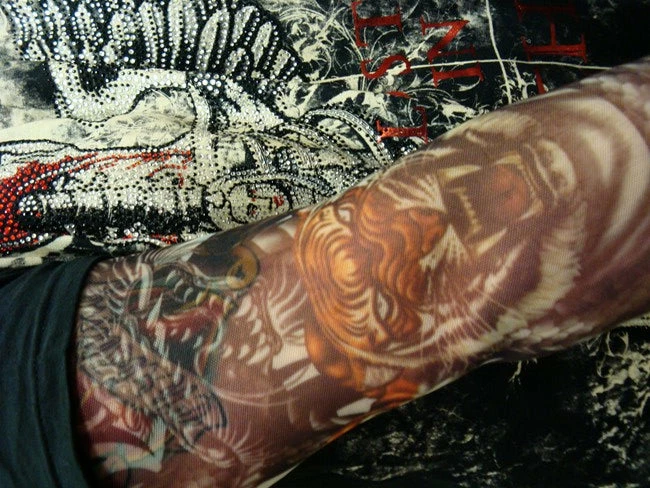 Sleeve tattoos that look real!! Vicious Tigers and Dragon Pair of Tattoo Sleeves. Introducing the NEW Tattoo Sleeve fashion accessory! Anyone that wants the cool tattooed look without the commitment (and pain) of getting a permanent tattoo will love these! This design features a sharp tribal design with a unique voodoo skeleton. These are perfect for men and woman.