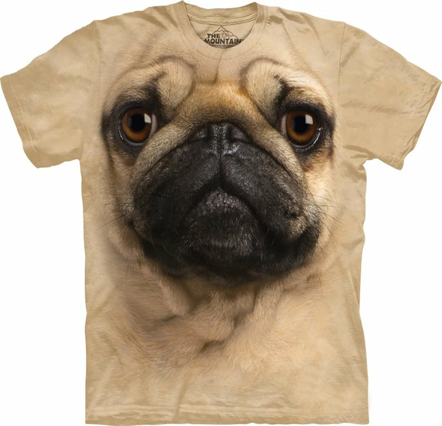 “HARK, World,” you scream from the highest hill. “I, (your name here), have found the fountain of youth and the elixir to war. I have found love, but not just any love, the love of a dog that with a curiously wrinkled glance, could make even the woodsiest of lumber jacks stop in his burly tracks and let out a pre-teen giggle. Yes, World,” you say, “I love Pugs”! But suddenly a thought strikes you as if Zeus commanded it. At this elevation, there’s no way your message could travel this vast world! Curses! If only there was a way every earthbound soul could see the depths of your passion! No fear, dear pug patron, The Mountain has you covered (literally) with this Big Face Pug Adult T-Shirt. It’s Medium weight, 100% Cotton, and pre-shrunk so that all will have the opportunity to experience the love that is pug.