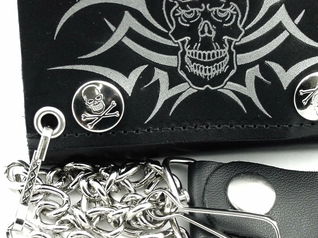Tribal Skull Genuine Leather Chain Wallet. Our Genuine Leather Chain Wallets Are made with you in mind, with all the compartments you need for all your valuables, money, credit cards ID cards and photos all in one great looking secure place. Made of 100% real leather these wallets are beefy and tough and of course look great! This Wallet comes complete with a removable 17” chrome chain that easily clips to a sturdy corner rivet on the wallet. This wallet can be used with the chain or without. To attach this chain wallet to you pants simply snap the leather button hoop to the front belt loop of your pants. This wallet is a great fashion statement but also secures your wallet and belongings safely to you making theft or loss of your wallet nearly impossible. the chain also features a loose clip that is perfect for attaching your keys keeping them safe and secure as well. The wallet itself features 4 separate compartments including 2 for your credit cards and IDs, one for pictures that holds 12 wallet sized photos and one over sized money compartment on the top that is big enough to hold any kind of international currency.