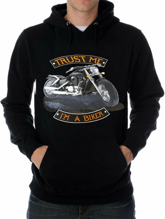 Look No Further, you have found on of the most Bad Ass Biker sweat shirts on the web. “Trust Me I’m A Biker” Biker Hoodie (Black)m, as a biker, you take pride in all you stand for, and now this exclusive line of Biker hoodies lets you wear whats on your mind. Forget prim and proper, these sweat shirts are blacked out and feature big, bold biker sayings on them. These hoodies look great beneath a leather vest, with a pair of your favorite jeans and those ol faithful boots that haven’t let you down in years. Every biker hoodie is available on any color hoodie you want…. as long as the color you want is black
