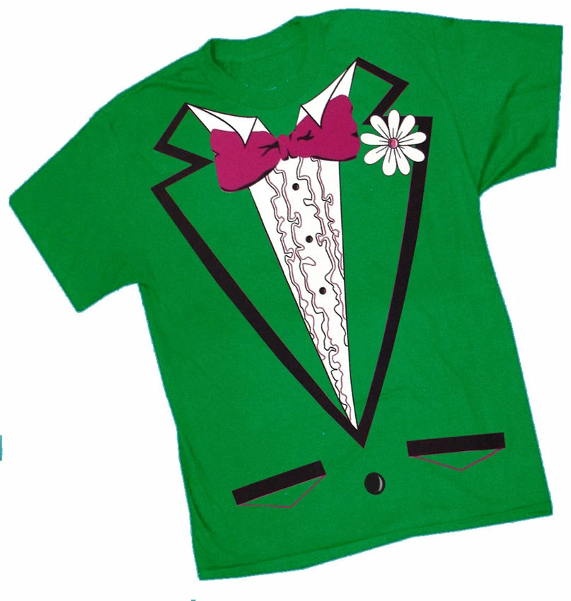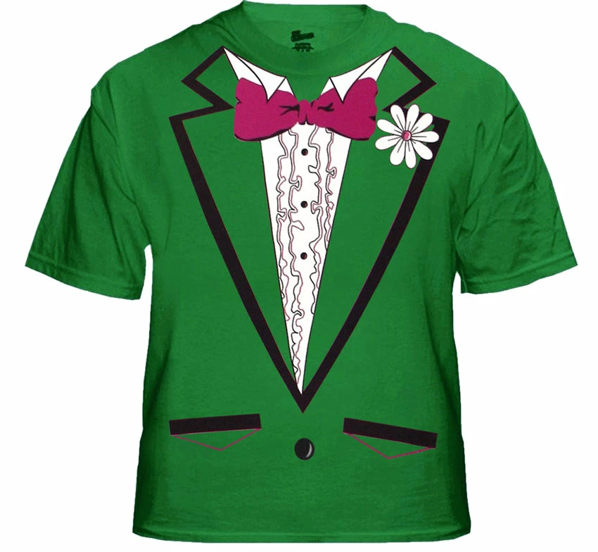 Mens Irish Green Ruffled Tuxedo T-Shirt. “I want to be formal, BUT I’M HERE TO PARTY!” This tuxedo t-shirt combines the classy, formal appearance of a tuxedo with the comfort and cool style of a t-shirt. If you are going to party you need a tux tee! Weddings, Bar Mitzvahs, Bachelor Parties, Keg Parties or any where! Tuxedo t-shirts have you covered when attire is required, but you refuse to put on all that stuffy formal clothing! Be cool, relax, and enjoy yourself at your next family bbq, award ceremony or High School prom!