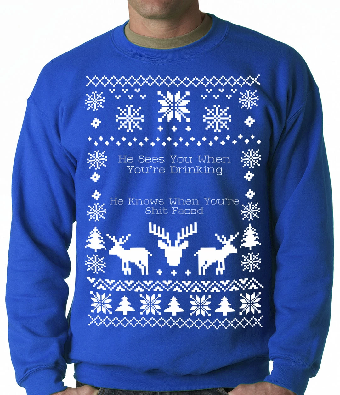 Get your hands on this amazing Ugly Christmas Sweater He Sees You When You’re Shit Faced Top. All of our Ugly Christmas Sweater He Sees You When You’re Shit Faced Tops have a classic, comfortable fit as well as being pre-shrunk, so you can expect little to no shrinkage.