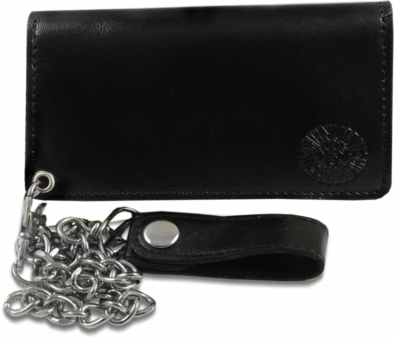 Each of our premium Biker Chain Wallets are made of 100% genuine leather and includes a 17″ steel chain that easily clips to any belt loop. This Biker Style Chain wallet has heavy duty steel buttons to keep the wallet snapped shut. The inside compartment features 2 large bill and currency compartments that do not fold your money, keeping your money neat and organized. A separate coin compartment has a zipper top and doubles to hold your license, credit cards and other small documents such as registrations, permits and receipts. This wallet measures 6″ x 3 1/2″.