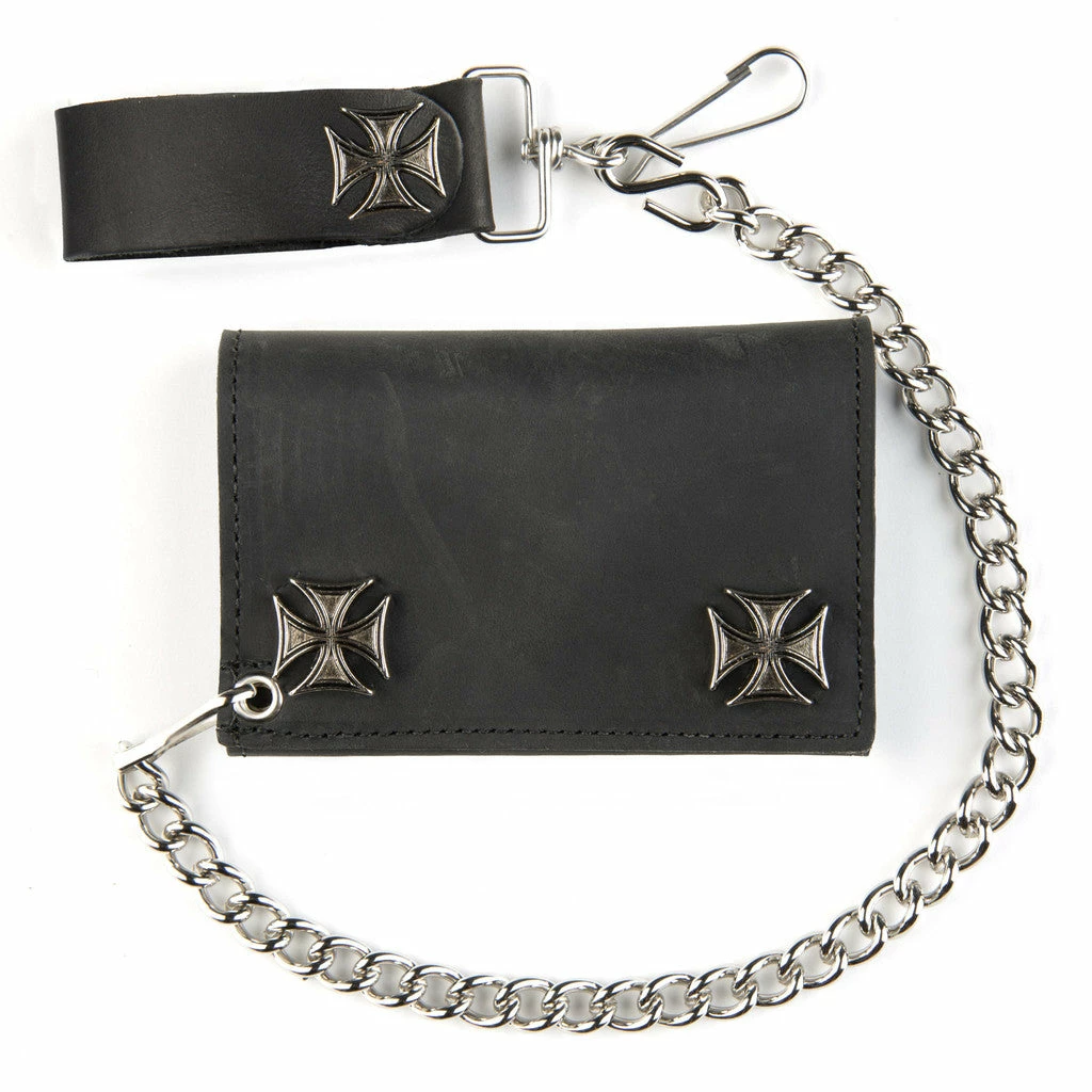 Bewild Wallets & Chains Black Leather Tri-Fold Wallet With Iron Cross Snaps And 12 Inch Chain