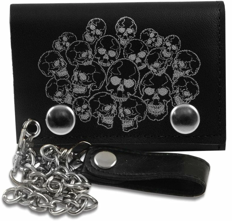 Skull Pile Genuine Leather Chain Wallet. Our Genuine Leather Chain Wallets Are made with you in mind, with all the compartments you need for all your valuables, money, credit cards ID cards and photos all in one great looking secure place. Made of 100% real leather these wallets are beefy and tough and of course look great! This Wallet comes complete with a removable 17” chrome chain that easily clips to a sturdy corner rivet on the wallet. This wallet can be used with the chain or without. To attach this chain wallet to you pants simply snap the leather button hoop to the front belt loop of your pants. This wallet is a great fashion statement but also secures your wallet and belongings safely to you making theft or loss of your wallet nearly impossible. the chain also features a loose clip that is perfect for attaching your keys keeping them safe and secure as well. The wallet itself features 4 separate compartments including 2 for your credit cards and IDs, one for pictures that holds 12 wallet sized photos and one over sized money compartment on the top that is big enough to hold any kind of international currency.