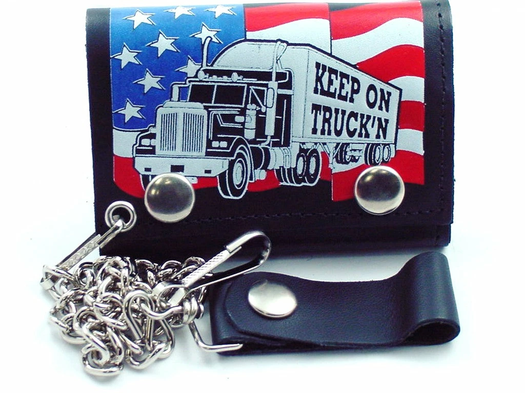 Keep On Truck’n Genuine Leather Chain Wallet.Our Genuine Leather Chain Wallets Are made with you in mind, with all the compartments you need for all your valuables, money, credit cards ID cards and photos all in one great looking secure place. Made of 100% real leather these wallets are beefy and tough and of course look great! This Wallet comes complete with a removable 17” chrome chain that easily clips to a sturdy corner rivet on the wallet. To attach this chain wallet to you pants simply snap the leather button hoop to the front belt loop of your pants. This wallet is a great fashion statement but also secures your wallet and belongings safely to you making theft or loss of your wallet nearly impossible. the chain also features a loose clip that is perfect for attaching your keys keeping them safe and secure as well. The wallet itself features 4 separate compartments including 2 for your credit cards and IDs, one for pictures that holds 12 wallet sized photos and one over sized money compartment on the top that is big enough to hold any kind of international currency.