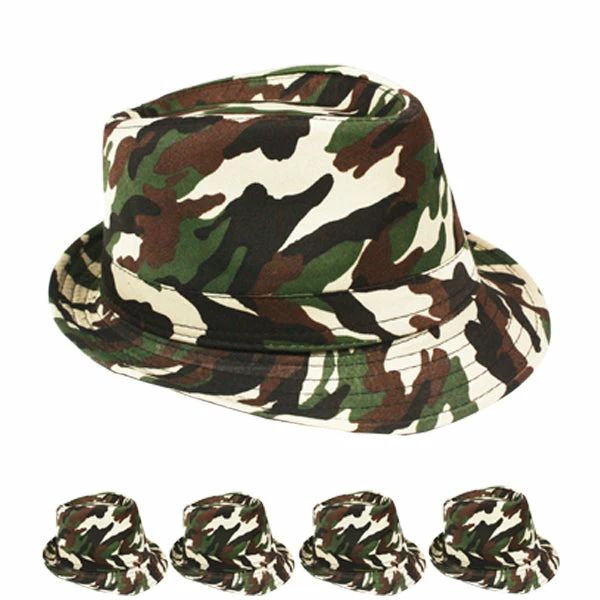 Woodland Camouflage Fedora Hat. The fedora hat is creased lengthwise down the crown and pinched in the front on both sides. Similar hats with a C-crown (with an indentation for the head in the top of the crown) are occasionally called fedoras. The term fedora was in use as early as 1891. Beginning in the 20th century, the fedora came into use as an upper-class clothing accessory. Hats that resemble the soft felt version are often called fedoras even if they are made of straw or twill. This Fedora hat is made of 100% cotton and has a woodland camo pattern. Perfect for a night out on the town! One size fits all.