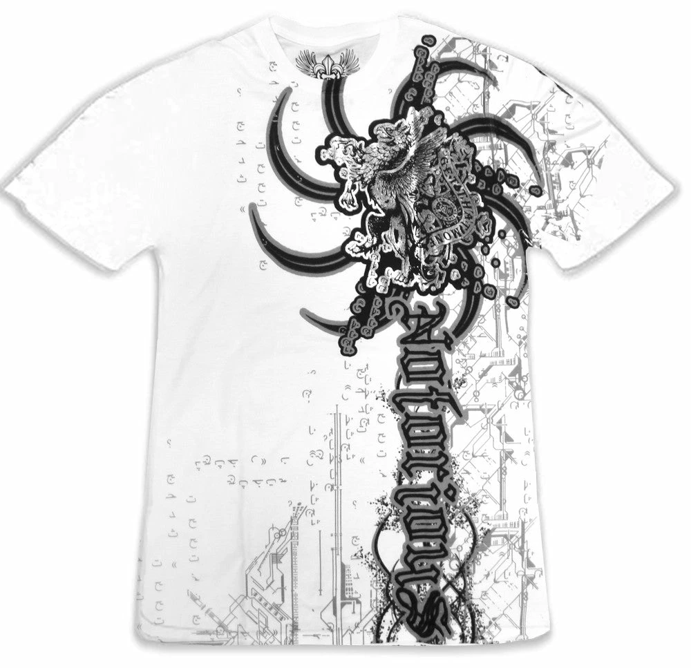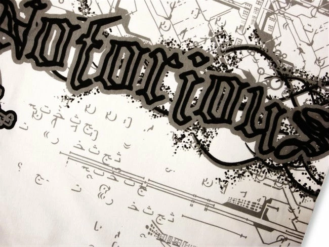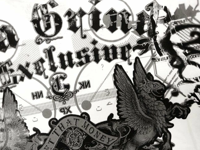 This white t-shirt has a large design featuring a silver guilded Griffin and other grey industrial accents. The back of this shirt contains many subtle details including a full griffin crest & the da grind logo. Through out the entire design there is silver foiled accents for an extra cool look. You are sure to be noticed in this shirt.