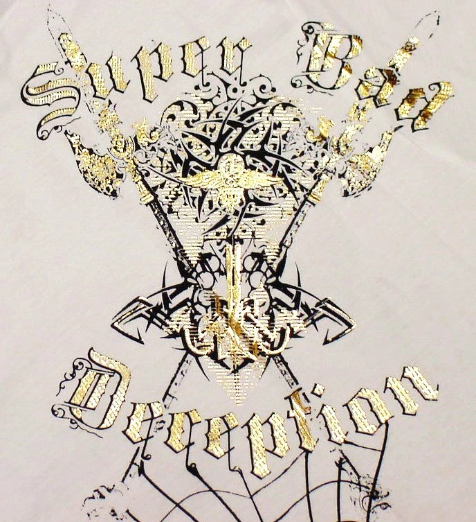 This white t-shirt has a large design featuring a tribal excaliber sword guilded in gold foil with the words “Super Bad Deception”. This shirt also features a hanging spider web with a wicked black widow spider. The back of this shirt contains many subtle details including another large excaliber sword, more black widow spiders, tribal designs and the quote “super bad deception”. Through out the entire design there is gold foiled accents for an extra cool look. You are sure to be noticed in this shirt.