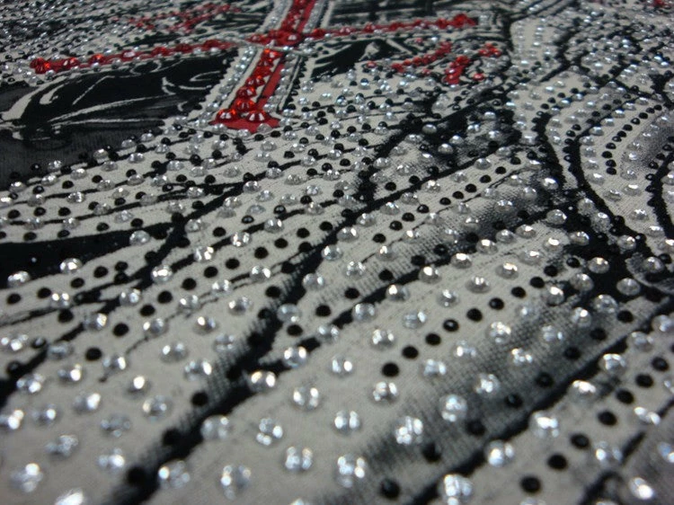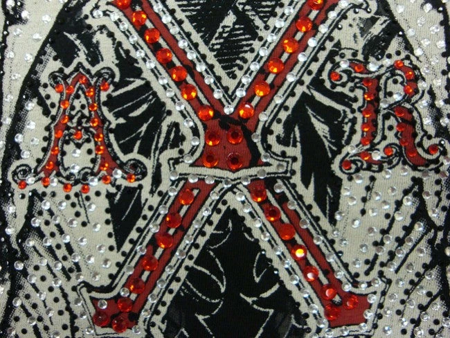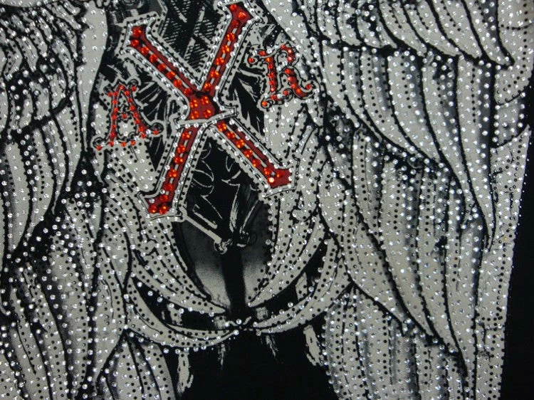 Decorate your self with this war torn Xzavier Style. This shirt is printed on a premium quality, super soft vintage tee for maximum comfort and wearability. Xzavier Da Grind “Midnight Flight Couture” Rhinestone T-Shirt features thousands of premium quality crystal rhinestones that shine light and add a true hand made feel to this incredible piece of wearable art. Tens of Thousands of Clear, Black & Red rhinestone accent the wings and crest on the back of the shirt. In addition, this shirt features classic crimson leaf accents over the front Midnight Flight design to further accentuate the rhinestones. The back of the shirt features an amazing angel wing back print.