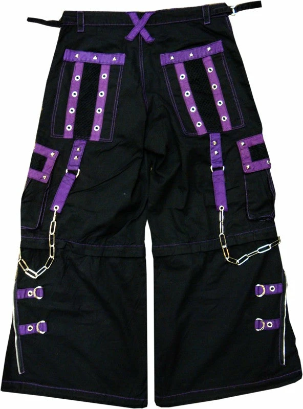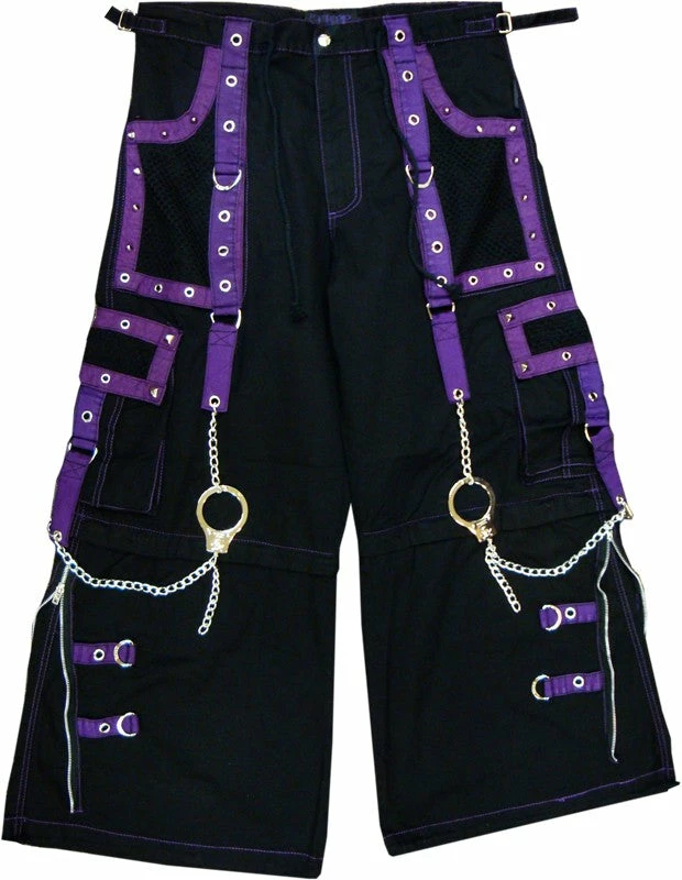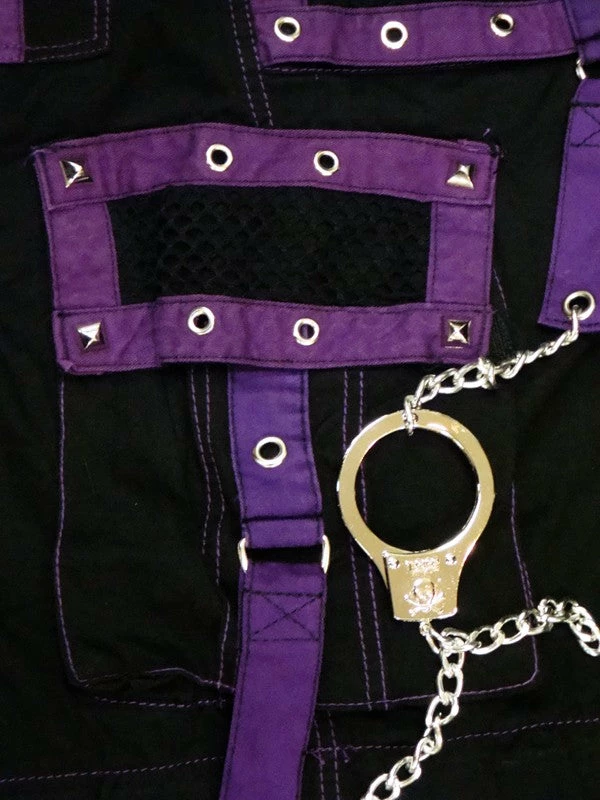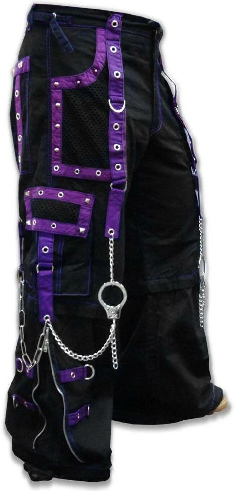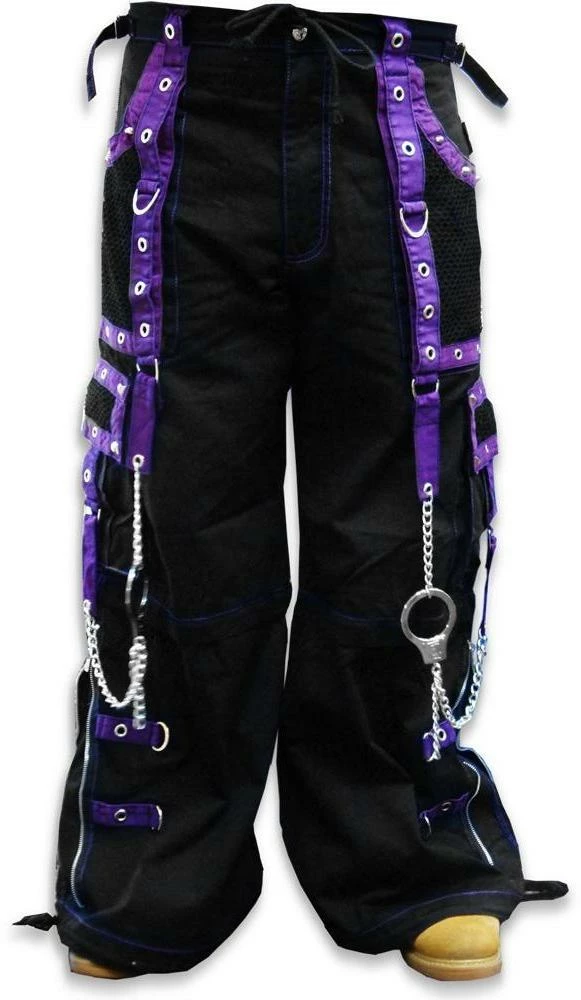 Tripp NYC “Death Row” Bondage Pants. These pants have it all, Midnight Purple Straps, Vibrant contrast stitching, chrome zippers, and hot grommet, Pyramid Stud & Hand Cuff Chain accents. Tripp NYC “Death Row” Bondage Pants Feature deep front pockets, oversized back pockets and decorated cargo pockets and have enough storage to fit all your goodies and baddies. All the straps on the Tripp NYC “Death Row” Bondage Pants are removable, just in case you want to tone down the look, but why would you want to do that? Draw string waist and bottoms mean the pants are going to fit you PERFECT. Need we say more?