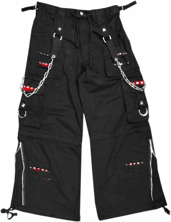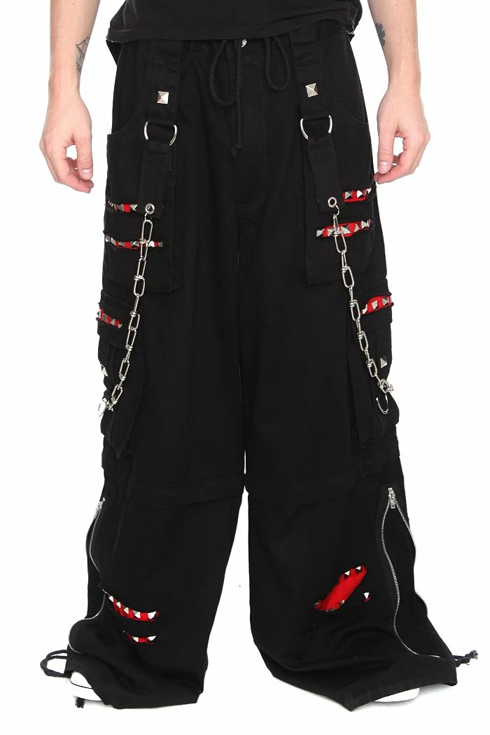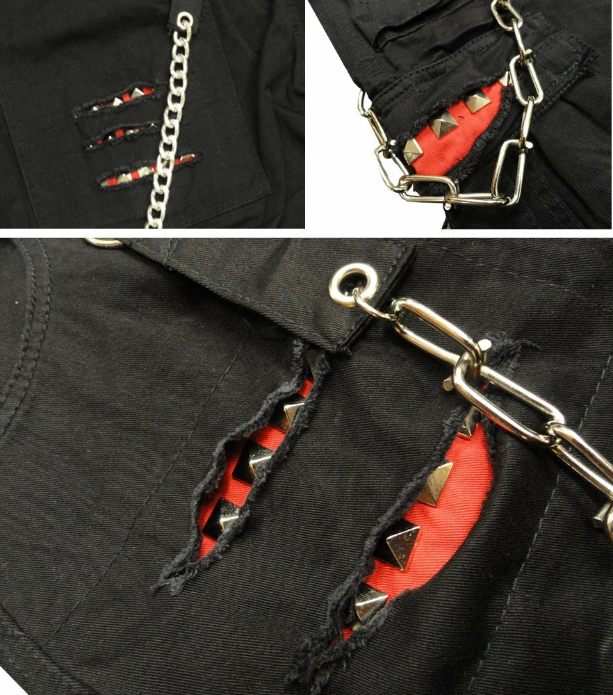 Tripp NYC “Slashed Combat” Bondage Pants. These pants have it all, Chrome Steel Chains, metal zippers, worn steel accents, Slashed black twill material with red accents and pyramid studs top off the slashes. Tripp NYC “Slashed Combat” Bondage Pants Feature deep front pockets, oversized back pockets and decorated cargo pockets and have enough storage to fit all your goodies and baddies. All the straps on the Tripp NYC “Slashed Combat” Bondage Pants are removable, just in case you want to tone down the look, but why would you want to do that? Draw sting waist and bottoms mean the pants are going to fit you PERFECT. Zip off the legs to turn Tripp NYC “Slashed Combat” Bondage Pants in to a sweet pair of shorts. Need we say more?