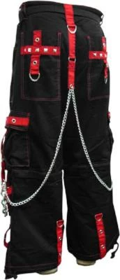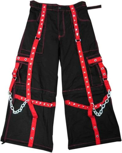 Tripp NYC “The Hands of Time” Bondage Pants.Tripp NYC “The Hands of Time” Bondage Pants. These pants have it all, Heavy Duty Chrome Chains, Red Straps, Vibrant contrast stitching, chrome zippers, zip off legs to shorts and hot grommet accents. Tripp NYC “The Hands of Time” Bondage Pants Feature deep front pockets, oversized back pockets and decorated cargo pockets and have enough storage to fit all your goodies and baddies. Zip off legs give you the option of wearing these pants as shorts for when things heat up. All the straps on the Tripp NYC “The Hands of Time” Bondage Pants are removable, just in case you want to tone down the look, but why would you want to do that? Draw sting waist and bottoms mean the pants are going to fit you PERFECT. Need we say more?